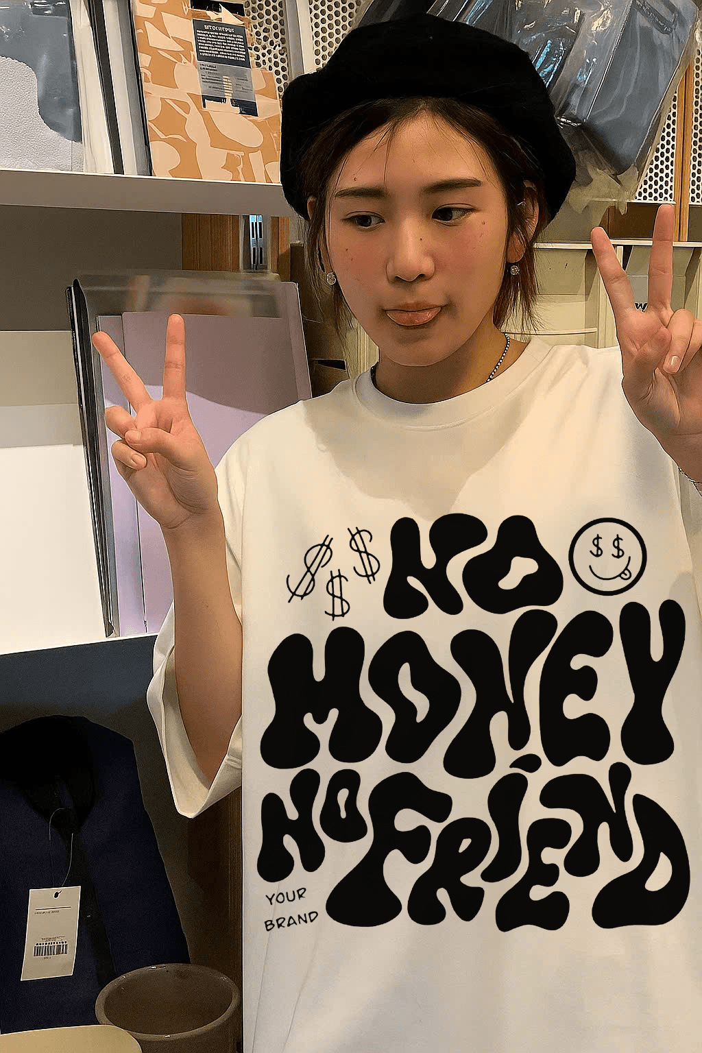 Unique NO MONEY NO FRIEND graphic print for a bold and standout look.
